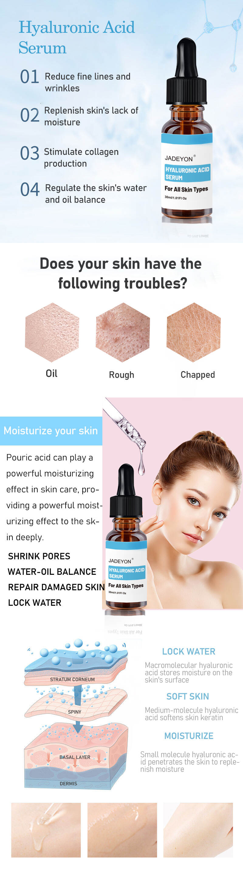 Hyaluronic acid hydrating face serum plumps and strengthens the skin for a healthy glow and an anti-wrinkle effect. Daily facial serum to hydrate with anti-wrinkle effect. Improve fine wrinkles, resist aging skin, and quickly moisturize and replenish skin.